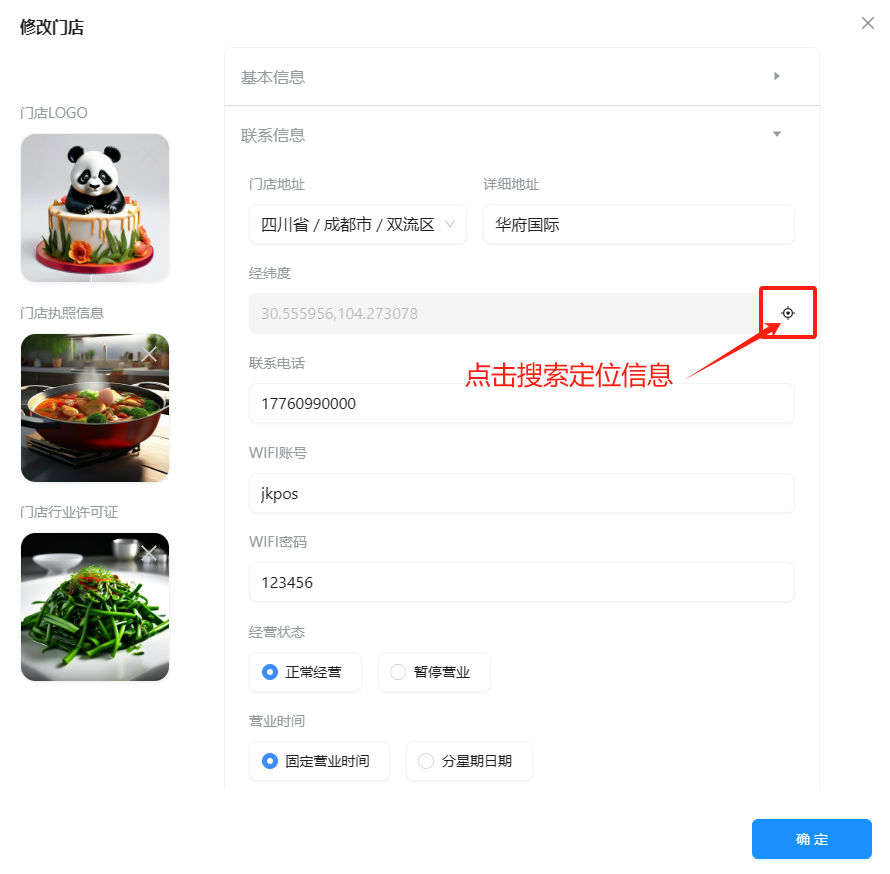 定位信息:点击定位按钮可修改定位信息,如果是首次登录设置,请参考“门店位置定位”