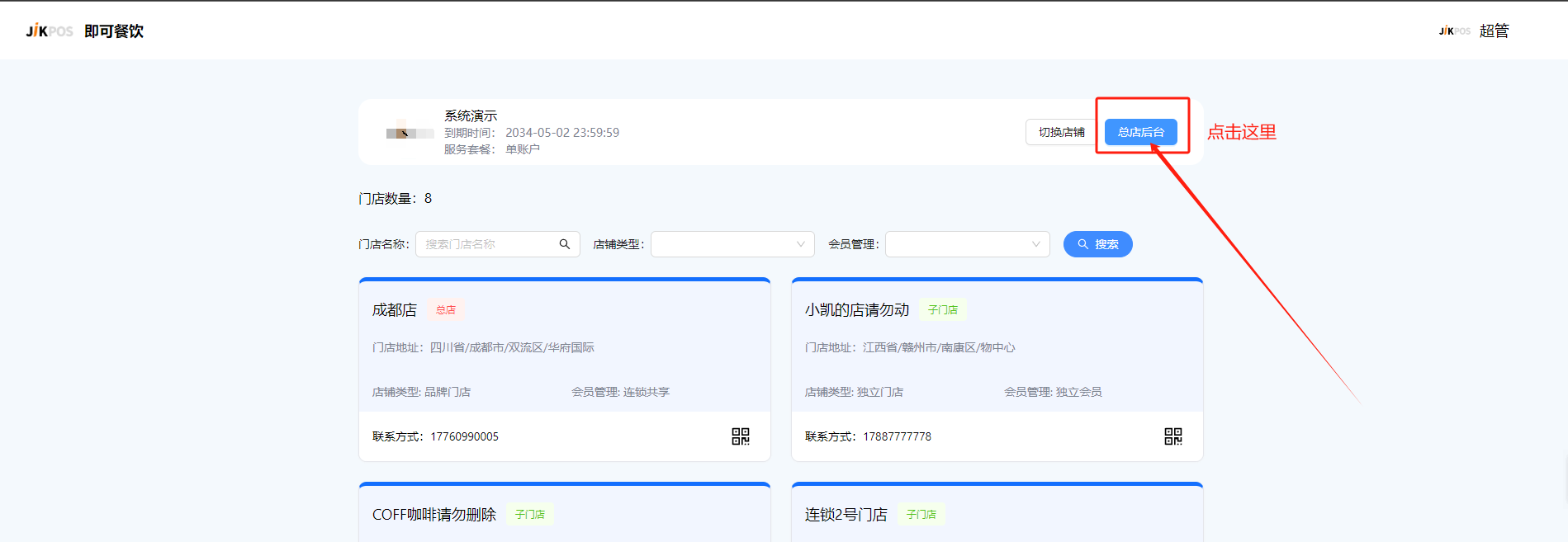 点击有上角【总店后台】进入。