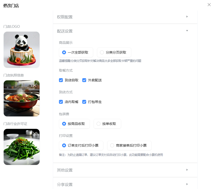 取餐方式:商家按经营需求勾选门店支持的取餐方式,勾选“外卖配送”才能使用外卖功能;