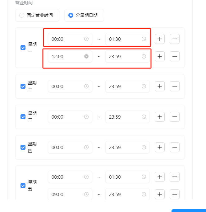 分星期日期:若是跨天营业,例如烧烤店、酒吧等,选择“分星期日期”,例如:营业时间为中午12点到凌晨01:30点,如下图配置。